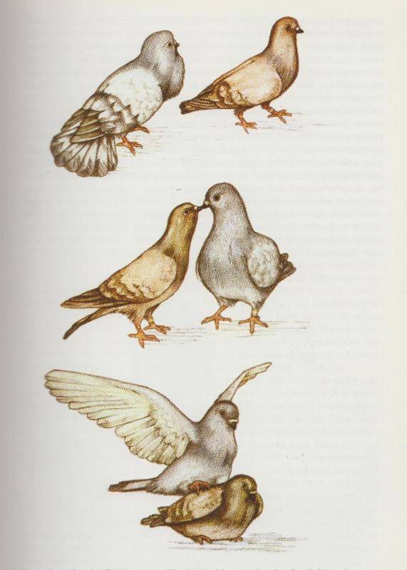 Om de dieren aan elkaar te koppelen, is het best, dat men ze eerst gedurende enige tijd gescheiden houd, in het voorjaar gaat dit heel gemakkelijk. In de zomer, als de dieren reeds gekoppeld zijn, zelfs al gebroed en gevoerd hebben is dat lastiger. Daartoe hebben we een paarkooi nodig. Men selecteert de dieren die we willen koppelen, en zetten ze in een hok waar ze elkaar wel kunnen zien , maar niet kunnen benaderen. Na enkele dagen kunnen ze bij elkaar gezet worden. Het juiste tijdstip, om met de kweek te beginnen, is niet op een dag af te bepalen. Het regelt zich geheel naar het weer. In geen geval voor 15 februari. De doffer zal de duivin het hof maken, waarbij hij zijn krop opblaast, krachtig koert, met zijn staart over de grond sleept en rondom zijn partner cirkelt, haar nauwelijks een ogenblik rust gunt. Kort daarna volgt de snavelkus waarbij de doffer voedsel in de snavel van de duivin opgeeft en na een serie cirkelende en buigende bewegingen en een diep aanhoudend koeren van de doffer , die zich ook overgeeft aan het regelmatig poetsen van de rugveren, duikt de duivin en springt de doffer op haar. Daarna geeft men het paar de gelegenheid het te vieren, wat ze doen met de typische bruidsvlucht, met geklapwiek en lang aangehouden glijvluchten . Heeft U dit eenmaal van al U duiven gezien, dan is uw eerste broedseizoen pas goed begonnen.