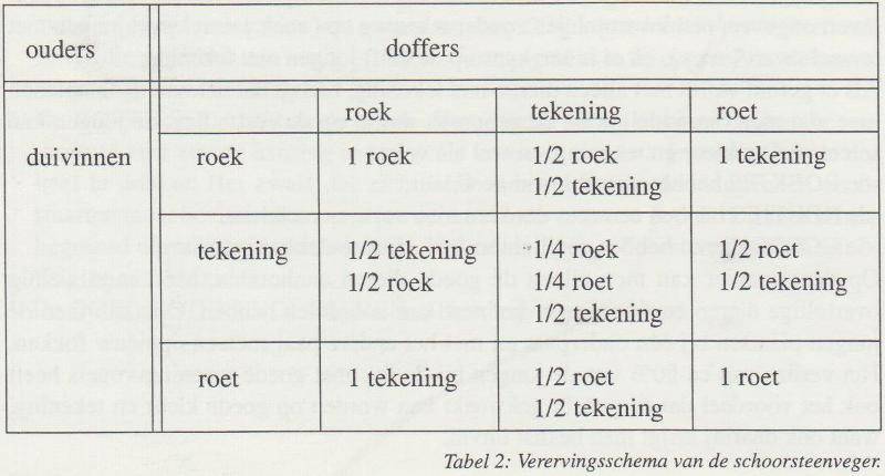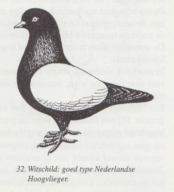 Het meest ideale is om en om wisselend met de grondkleur . In het algemeen mag het de grondkleur niet overheersen. Dus een ietsje meer grondkleur is het beste. Als er te grote witte velden op het vleugelschild voorkomen, is de duif te platerig. Te veel wit gaat al gauw in de richting van een witschild. Om daar dan een goede witschild van te krijgen, zal er waarschijnlijk te veel geplukt moeten worden: het witte schild wordt dan te dun. Ook de driehoek tussen de schouders en de hals basis moet aanwezig zijn .