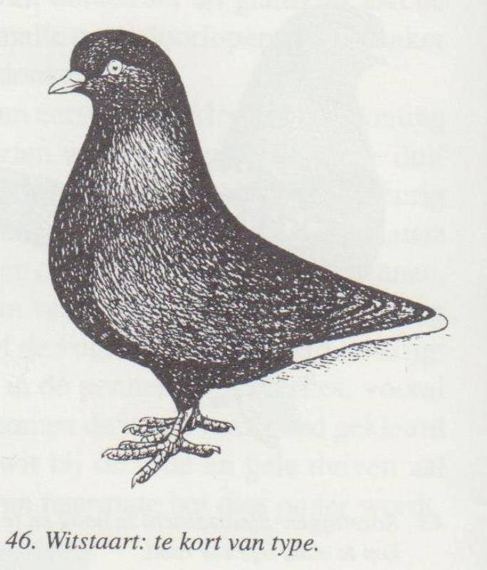 De staart is eerder kort dan lang, anders wordt het totale type weer te lang. Hij is recht en goed gesloten en wordt horizontaal gedragen. De vleugels zijn krachtig. De slagpennen rusten op de staart: ze mogen elkaar niet kruisen en reiken bijna tot aan de staartlengte. De vleugels moeten de rug goed afdekken, er mag geen ruimte tussen zijn . Is er wel een gaping tussen, dan noemt men dat een open rug. Zeker bij witschilden ontsiert dat de duif. De rug die dan rood, geel of zwart moet zijn, is dan zichtbaar tussen de schilden. De vleugels mogen niet hangen , een zwakke vleugeldracht wordt afgewezen.